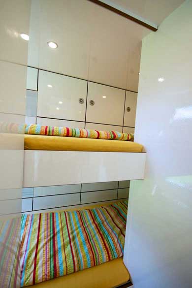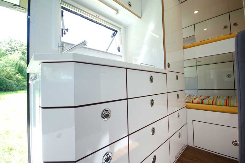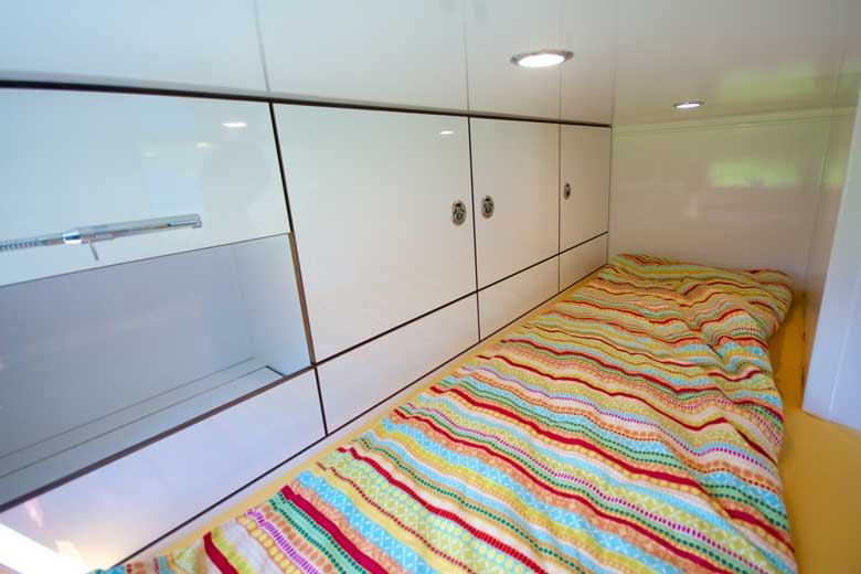 - Kleiderschrank seitlich vor dem Heckbett mit höhenverstellbaren Einlegeböden
