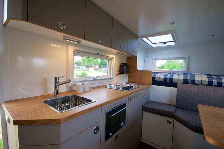 - Arbeitsplatte aus Eiche Furnierholz mit eingelassenem Edelstahl-Spülbecken