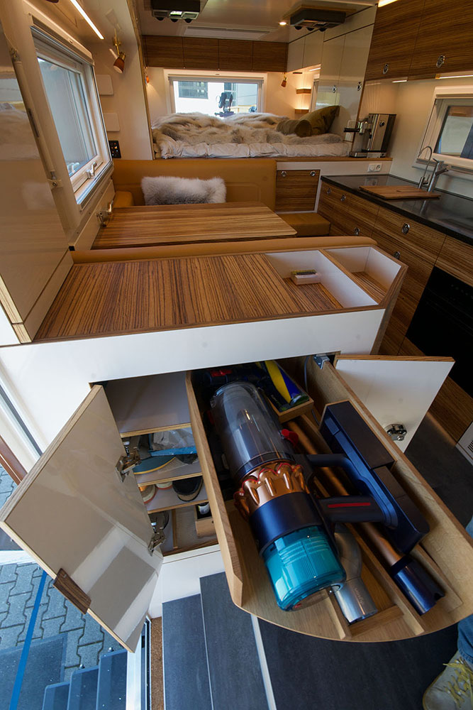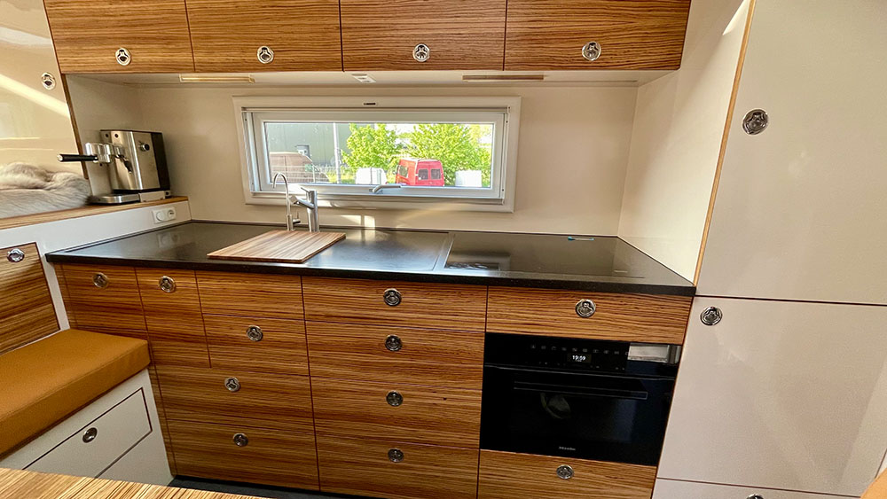 Kleiderschrank seitlich des Heckbettes mit höhenverstellbaren Einlegeböden